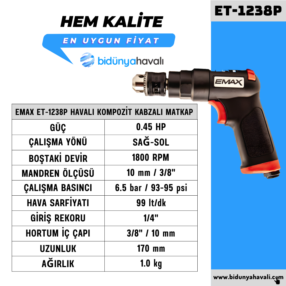 EMAX ET-1238P HAVALI KOMPOZİT KABZALI MATKAP 10 mm
