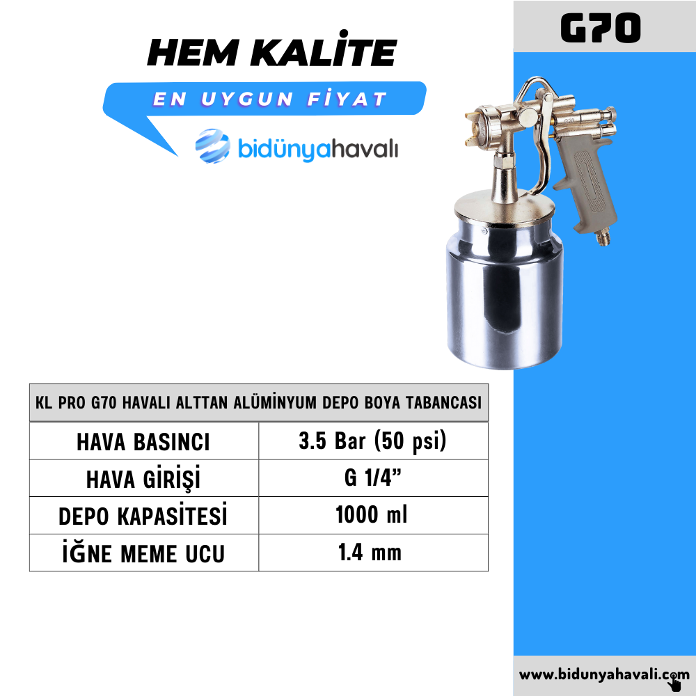 KL PRO G70 HAVALI ALTTAN ALÜMİNYUM DEPO BOYA TABANCASI 1.4 mm 1000 ml